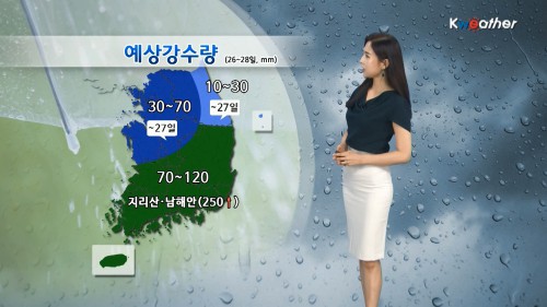 ³»ÀÏ(27ÀÏ‧¼ö)Àº À帶Àü¼±ÀÇ ¿µÇâÀ» ¹Þ°Ú´Ù. ¹Î°£±â»ó±â¾÷ ÄÉÀÌ¿þ´õ´Â ¡°³»ÀÏÀº Àü±¹ÀÌ È帮°í ºñ°¡ ¿À°ÚÀ¸³ª, ÁߺϺÎÁö¹æÀº »õº®¿¡ ºñ°¡ ±×Ä¡°Ú´Ù. ÇÑÆí, ÃæÃ»µµ¿Í °æºÏºÏºÎ´Â ³· µ¿¾È ¼Ò°»óŸ¦ º¸ÀÌ´Â °÷ÀÌ ¸¹°Ú´Ù¡±°í ÀüÇß´Ù. ÄÉÀÌ¿þ´õ ¿¹º¸°ü°èÀÚ´Â ¡°³»ÀÏ »õº®ºÎÅÍ ¿ÀÈıîÁö ÃæÃ»µµ¿Í ³²ºÎÁö¹æÀ» Áß½ÉÀ¸·Î µ¹Ç³°ú ÇÔ²² õµÕ¹ø°³¸¦ µ¿¹ÝÇÑ ½Ã°£´ç 30mmÀÌ»óÀÇ ¸Å¿ì °ÇÑ ºñ¿Í ÇÔ²² ¸¹Àº ºñ°¡ ¿À´Â °÷ÀÌ ÀÖ°ÚÀ¸´Ï, ºñ ÇÇÇØ ¾øµµ·Ï °¢º°È÷ ÁÖÀǹٶõ´Ù¡±°í ¿ä¸ÁÇß´Ù. * ¿¹»ó °¼ö·®(26ÀÏ~28ÀÏ) - ³²ºÎÁö¹æ, Á¦ÁÖµµ : 70~120mm(¸¹Àº °÷ Áö¸®»ê ºÎ±Ù, ³²ÇØ¾È 250mmÀÌ»ó) - ÁߺÎÁö¹æ(27ÀϱîÁö, °¿ø¿µµ¿ Á¦¿Ü) : 30~70mm - °¿ø¿µµ¿(27ÀϱîÁö) : 10~30mm * ÄÉÀÌ¿þ´õ ¹ßÇ¥ ¹Ì¼¼¸ÕÁö ³óµµ ¿¹º¸ - ȯ°æºÎ ±âÁØ : Àü±¹ ¡®º¸Å롯 - WHO ±Ç°í±âÁØ : Àü±¹ ¡®º¸Å롯 ³»ÀÏ ³· ÃÖ°í±â¿ÂÀº ¼¿ï‧¼ö¿ø‧¼ÓÃÊ 28¡É, ÀÎõ‧ºÎ»ê 24¡É, Ãáõ‧Á¦ÁÖ 27¡É, ´ëÀü‧±¤ÁÖ‧ÀüÁÖ 26¡É, ûÁÖ‧´ë±¸ 29¡É, °¸ª 31¡É°¡ ¿¹»óµÈ´Ù. Àü ÇØ»ó¿¡ ºñ°¡ ³»¸®¸é¼, ¹Ù´ÙÀÇ ¹°°áÀº ¸Å¿ì ³ô°Ô ÀϰڴÙ. ´çºÐ°£ Àå¸Àºñ´Â ³»·È´Ù ±×ÃÆ´Ù¸¦ ¹Ýº¹Çϸé¼, ´ÙÀ½ ÁÖ ÃʹݱîÁö À̾îÁú Àü¸ÁÀÌ´Ù.