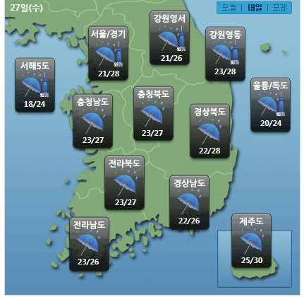 ¼ö¿äÀÏÀÎ ³»ÀÏ(27ÀÏ)µµ À帶Àü¼±ÀÇ ¿µÇâÀ¸·Î °÷°÷¿¡ ºñ°¡ ³»¸± Àü¸ÁÀÌ´Ù. ¹Î°£±â»ó±â¾÷ ÄÉÀÌ¿þ´õ´Â ¡°³»ÀÏ À帶Àü¼±ÀÇ ¿µÇâÀ» ¹Þ¾Æ Àü±¹ÀÌ È帮°í ºñ°¡ ¿À°ÚÀ¸³ª, ¼¿ï µî ÁߺϺÎÁö¹æÀº »õº®¿¡ ºñ°¡ ±×Ä¡°Ú°í ÃæÃ»µµ¿Í °æºÏºÏºÎ´Â ³· µ¿¾È ¼Ò°»óŸ¦ º¸ÀÌ´Â °÷ÀÌ ¸¹°Ú´Ù¡±°í ¿¹º¸Çß´Ù. * ¿¹»ó °¼ö·®(26ÀÏ~28ÀÏ) - ³²ºÎÁö¹æ, Á¦ÁÖµµ : 70~120mm(¸¹Àº °÷ Áö¸®»ê ºÎ±Ù, ³²ÇØ¾È 250mmÀÌ»ó) - ÁߺÎÁö¹æ(27ÀϱîÁö, °¿ø¿µµ¿ Á¦¿Ü) : 30~70mm - °¿ø¿µµ¿(27ÀϱîÁö) : 10~30mm ÀÌ¾î ¡°»õº®ºÎÅÍ ¿ÀÈıîÁö ÃæÃ»µµ¿Í ³²ºÎÁö¹æÀ» Áß½ÉÀ¸·Î µ¹Ç³°ú õµÕ¡¤¹ø°³¸¦ µ¿¹ÝÇÑ ½Ã°£´ç 30mm ÀÌ»óÀÇ ¸Å¿ì °ÇÑ ºñ¿Í ÇÔ²² ¸¹Àº ºñ°¡ ¿À´Â °÷ÀÌ ÀÖ°ÚÀ¸´Ï ºñ ÇÇÇØ°¡ ¾øµµ·Ï ÁÖÀǰ¡ ¿ä±¸µÈ´Ù¡±°í ÀüÇß´Ù. ¾ÆÄ§ÃÖÀú±â¿ÂÀº 21¡Éµµ¿¡¼ 25¡É, ³· ÃÖ°í±â¿ÂÀº 24¡É¿¡¼ 3¡É°¡ µÇ°Ú´Ù. ´çºÐ°£ Àå¸Àºñ°¡ ³»¸®¸é¼ ´õÀ§°¡ ÇÑÇ® ²ª¿© ³· ±â¿ÂÀº Æò³â°ú ºñ½ÁÇÑ ¼öÁØÀ» º¸À̰ڴÙ.