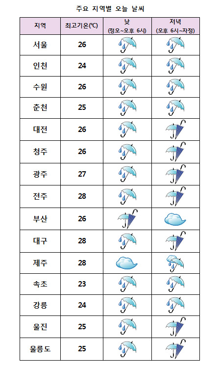 ¿À´Ã ³· ±â¿ÂÀº ÀÎõ¡¤°¸ª 24¡É, ¼¿ï¡¤Ã»ÁÖ¡¤ºÎ»ê 26¡É, ´ë±¸¡¤Á¦ÁÖ 28¡É µî Àü±¹ÀÌ 23~28¡ÉÀÇ ºÐÆ÷¸¦ º¸À̰ڴÙ.