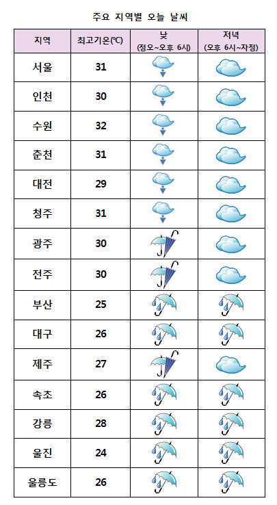 È¿äÀÏÀÎ ¿À´Ã(3ÀÏ)Àº ÁߺÎÁö¹æÀÌ È帰 °¡¿îµ¥ ¼Ò³ª±â°¡ ³»¸®´Â °÷ÀÌ ÀÖ°Ú°í, ³²ºÎÁö¹æ°ú ¿µµ¿¿¡ ºñ°¡ ¿À°Ú´Ù. ¹Î°£±â»ó±â¾÷ ÄÉÀÌ¿þ´õ´Â ¡°¿À´Ã ¿ì¸®³ª¶ó´Â ºÏ»óÇÏ´Â Á¦ 7È£ ÅÂdz ¡®»Ú¶ó»ß·é(PRAPIROON)¡¯ÀÇ ¿µÇâÀ» ¹Þ°Ú´Ù¡±¸ç ¡°Àü±¹ÀÌ È帮°í ³²ÇؾȺÎÅÍ ºñ°¡ ½ÃÀ۵оÆÄ§¿¡ ³²ºÎÁö¹æÀ¸·Î È®´ëµÇ°Ú´Ù¡±°í ¿¹º¸Çß´Ù. ÀÌ¾î ¡°¼¿ï°ú °æ±âµµ, °¿ø¿µ¼, ÃæÃ»µµ´Â ¿ÀÈÄ ÇѶ§ ¼Ò³ª±â°¡ ¿À´Â °÷ÀÌ ÀÖ°Ú´Ù¡±¸ç ¡°¹ã¿¡ °¿ø¿µµ¿°ú °æ»óµµ¸¦ Á¦¿ÜÇÑ ³²ºÎ ´ëºÎºÐ Áö¿ª¿¡¼ ºñ°¡ ±×Ä¡°Ú´Ù¡±°í ÀüÇß´Ù. * ¿¹»ó °¼ö·®(2~3ÀÏ) - °¿ø¿µµ¿, °æ»óµµ, Á¦ÁÖµµ : 50~100mm(¸¹Àº °÷ Áö¸®»ê ºÎ±Ù, Á¦Áֻ갣, °æ»óÇØ¾È 150mm ÀÌ»ó) - ¼¿ï. °æ±â, °¿ø¿µ¼, ÃæÃ»µµ, Àü¶óµµ : 10~40mm ¿À´Ã ³· ÃÖ°í±â¿ÂÀº ¼¿ï¡¤Ãáõ¡¤Ã»ÁÖ 31¡É, ±¤ÁÖ¡¤ÀüÁÖ 30¡É, ºÎ»ê 25¡É µî Àü±¹ÀÌ 24~32¡ÉÀÇ ºÐÆ÷¸¦ º¸À̰ڴÙ.