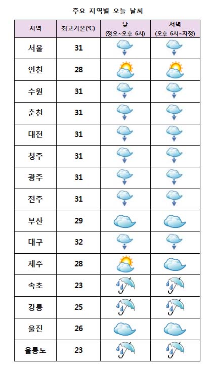 ¿À´Ã ³· ±â¿ÂÀº ¼¿ï¡¤´ëÀü¡¤±¤ÁÖ 31¡É, ºÎ»ê 29¡É, ¼ÓÃÊ 23¡É µî Àü±¹ÀÌ 23~32¡ÉÀÇ ºÐÆ÷¸¦ º¸À̰ڴÙ.