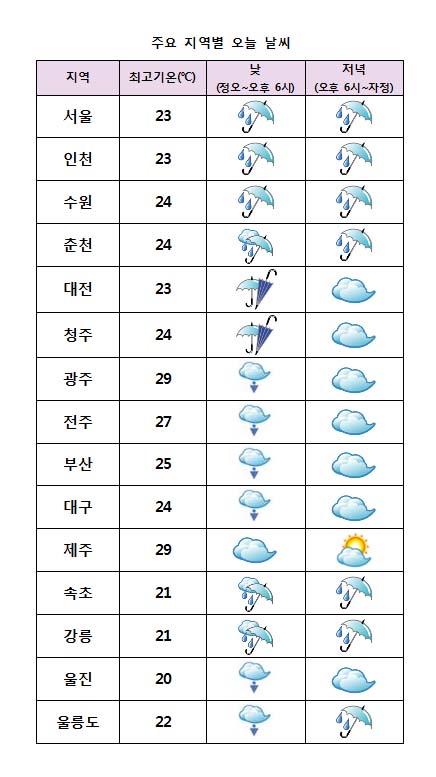 * ¿¹»ó °¼ö·®(9~10ÀÏ) - ÁߺÎÁö¹æ(°¿ø¿µµ¿ Á¦¿Ü, ÃæÃ»µµ 9ÀÏ) : 30~80mm(¸¹Àº °÷ 120mmÀÌ»ó) - °¿ø¿µµ¿, ³²ºÎÁö¹æ(9ÀÏ) : 10~40mm ³· ÃÖ°í±â¿ÂÀº ¼¿ï¡¤´ëÀü 23¡É, ºÎ»ê 25¡É, ±¤ÁÖ 29¡É µî Àü±¹ÀÌ 20~29¡ÉÀÇ ºÐÆ÷¸¦ º¸À̰ڴÙ.
