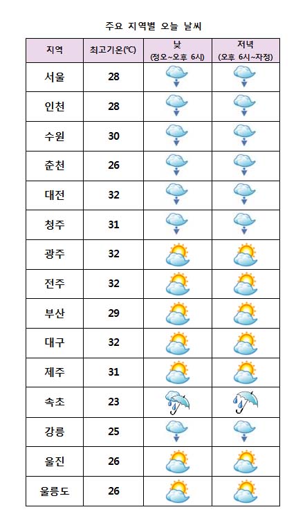 ÀÌ¾î ¡°°æ±âºÏºÎ, °¿øºÏºÎ´Â È帮°í ºñ°¡ ¿À°Ú°í, ¾ÆÄ§ºÎÅÍ ´ÊÀº ¿ÀÈÄ»çÀÌ¿¡´Â ¼Ò°»óŸ¦ º¸À̰ڴÙ. ³²ºÎÁö¹æÀº ±¸¸§ÀÌ ¸¹°Ú´Ù¡±°í ÀüÇß´Ù. * ¿¹»ó °¼ö·®(10~11ÀÏ) - °æ±âºÏºÎ, °¿øºÏºÎ : 10~40mm ¿À´Ã ³· ÃÖ°í±â¿ÂÀº ¼¿ï¡¤ÀÎõ 28¡É, ±¤ÁÖ¡¤´ë±¸ 32¡É, ºÎ»ê 29¡É µî Àü±¹ÀÌ 26~32¡ÉÀÇ ºÐÆ÷¸¦ º¸À̰ڴÙ.