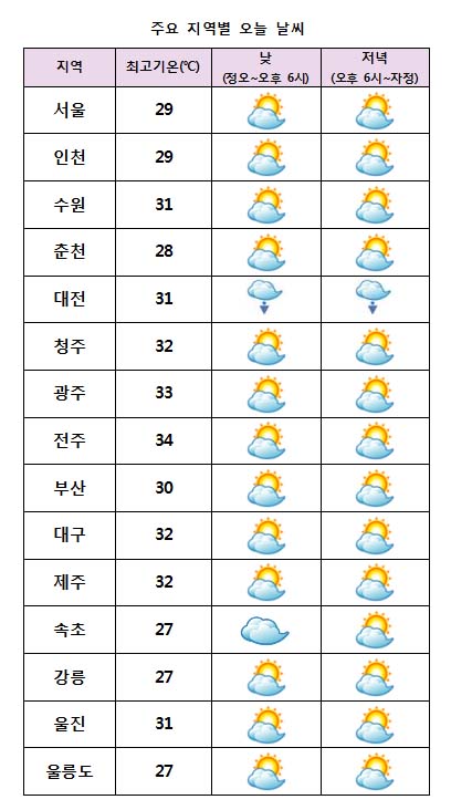 ¿À´Ã ³· ±â¿ÂÀº ¼¿ï 29¡É, ´ëÀü 31¡É, ´ë±¸¡¤Á¦ÁÖ 32¡É, ±¤ÁÖ 33¡É µî Àü±¹ÀÌ 27~34¡ÉÀÇ ºÐÆ÷¸¦ º¸À̰ڴÙ.
