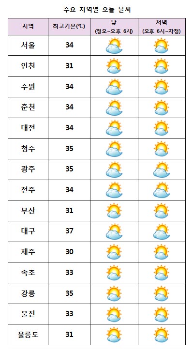 ¼¿ï¡¤Ãáõ¡¤´ëÀü¡¤ÀüÁÖ 34¡É, ºÎ»ê¡¤ÀÎõ 31¡É, ´ë±¸ 37¡É µî Àü±¹ÀÌ 30~37¡ÉÀÇ ºÐÆ÷¸¦ º¸À̰ڴÙ.