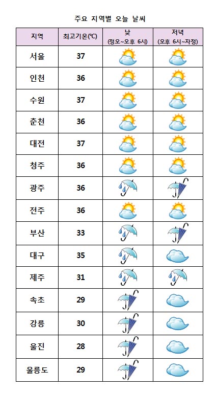 ¿À´Ã ³· ÃÖ°í±â¿ÂÀº ¼¿ï¡¤´ëÀü 37¡É, ±¤ÁÖ 36¡É, ´ë±¸ 35¡É, ºÎ»ê 33¡É µî Àü±¹ÀÌ 28~37¡ÉÀÇ ºÐÆ÷¸¦ º¸À̰ڴÙ.