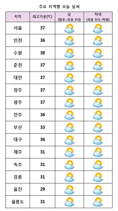 ¿À´Ã ³· ÃÖ°í±â¿ÂÀº ¼¿ï¡¤´ëÀü¡¤±¤ÁÖ 37¡É, ºÎ»ê 33¡É, ¼ÓÃÊ¡¤Á¦ÁÖ 31¡É µî Àü±¹ÀÌ 29~38¡ÉÀÇ ºÐÆ÷¸¦ º¸À̰ڴÙ.