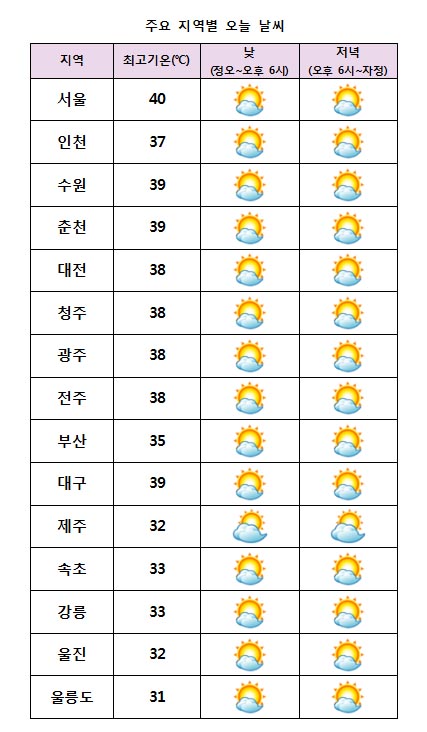 ¿À´Ã ³· ÃÖ°í±â¿ÂÀº ¼¿ï 40¡É, Ãáõ¡¤´ë±¸ 39¡É, ±¤ÁÖ 38¡É, ¼ÓÃÊ¡¤°¸ª 33¡É µî Àü±¹ÀÌ 31~40¡ÉÀÇ º»Æ÷¸¦ º¸À̰ڴÙ.