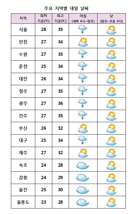 °¿ø¿µµ¿°ú °æ»óÇØ¾ÈÀ» Á¦¿ÜÇÑ Àü±¹ ´ëºÎºÐ Áö¿ª¿¡ Æø¿°°æº¸°¡ ¹ßÈ¿µÈ °¡¿îµ¥ ³· ±â¿ÂÀº Àü±¹ÀÌ 28~35¡ÉÀÇ ºÐÆ÷¸¦ º¸À̰ڴÙ.