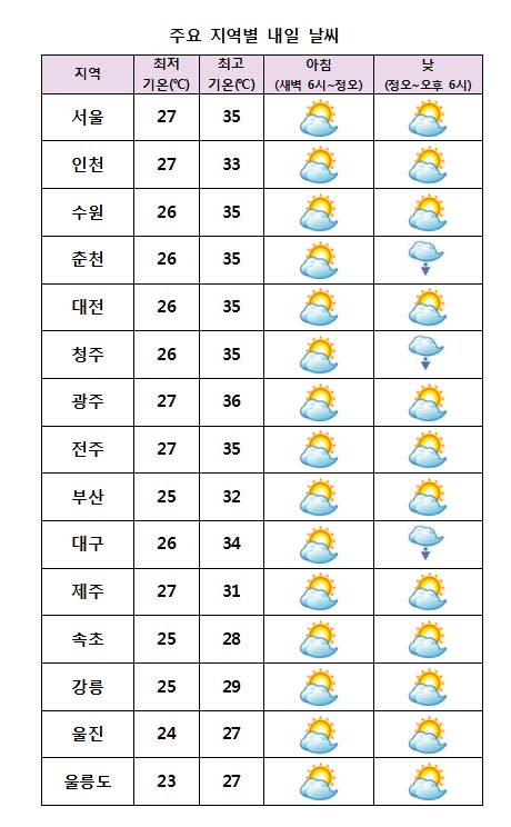 ¾ÆÄ§ ÃÖÀú±â¿ÂÀº 23¡Éµµ¿¡¼ 27¡É, ³· ÃÖ°í±â¿ÂÀº 27¡É¿¡¼ 36¡É°¡ µÇ°Ú´Ù.