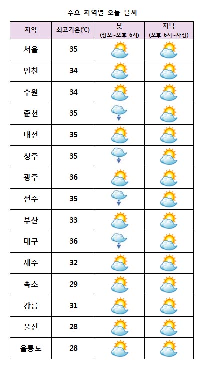 ¿À´Ã ³· ±â¿ÂÀº ¼¿ï¡¤´ëÀü¡¤Ãáõ 35¡É, ºÎ»ê 33¡É, °¸ª 31¡É µî Àü±¹ÀÌ 28~36¡ÉÀÇ ºÐÆ÷¸¦ º¸À̰ڴÙ.