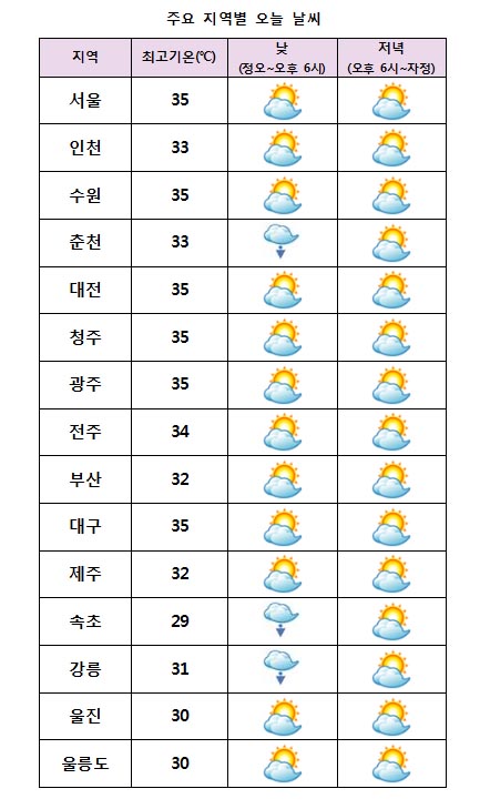 ¿À´Ã ³· ÃÖ°í±â¿ÂÀº ¼¿ï¡¤´ëÀü¡¤´ë±¸¡¤±¤ÁÖ 35¡É, ºÎ»ê¡¤Á¦ÁÖ 32¡É µî Àü±¹ÀÌ 29~35¡ÉÀÇ ºÐÆ÷¸¦ º¸À̰ڴÙ.