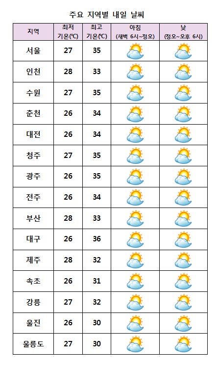 ¾ÆÄ§ ÃÖÀú±â¿ÂÀº 26¡É¿¡¼ 28¡É, ³· ÃÖ°í±â¿ÂÀº 30¡É¿¡¼ 36¡É°¡ µÇ°Ú´Ù.