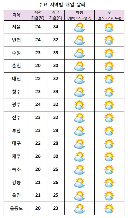 ÀϺΠÁö¿ªÀº Æø¿°Æ¯º¸°¡ ¿Ïȵǰųª ÇØÁ¦µÉ ¼ö ÀÖ°ÚÀ¸³ª ¼ÂÊÁö¹æÀº ³· ÃÖ°í±â¿ÂÀÌ 33¡É ÀÌ»ó ¿À¸£´Â °÷ÀÌ ÀÖ´Â µî ¹«´õÀ§°¡ °è¼Ó À̾îÁö°Ú´Ù. ¾ÆÄ§ ÃÖÀú±â¿ÂÀº 20¡É¿¡¼ 26¡É, ³· ÃÖ°í±â¿ÂÀº 23¡É¿¡¼ 34¡É°¡ ¿¹»óµÈ´Ù.