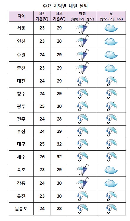 ¾ÆÄ§ ÃÖÀú±â¿ÂÀº 23~26¡É, ³· ÃÖ°í±â¿ÂÀº 28~32¡ÉÀÇ ºÐÆ÷¸¦ º¸À̰ڴÙ. ³²ºÎ³»·úÀ» Áß½ÉÀ¸·Î ³»ÀÏ(30ÀÏ) ºñ°¡ ¿À±â Àü±îÁö ³· ÃÖ°í±â¿ÂÀÌ 33¡É ÀÌ»ó ¿À¸£´Â °÷µµ ÀÖ°Ú´Ù.