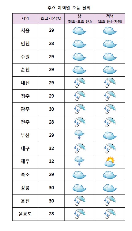 ¿À´Ã ³· ±â¿ÂÀº ¼¿ï¡¤´ëÀü¡¤ºÎ»ê 29¡É, ±¤ÁÖ¡¤°¸ª 30¡É, ´ë±¸¡¤Á¦ÁÖ 32¡É µî Àü±¹ÀÌ 28~32¡ÉÀÇ ºÐÆ÷¸¦ º¸À̰ڴÙ.