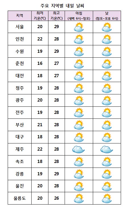 ¾ÆÄ§ ÃÖÀú±â¿ÂÀº 14¡É¿¡¼ 22¡É, ³· ÃÖ°í±â¿ÂÀº 26¡É¿¡¼ 30¡É°¡ µÇ°Ú´Ù.