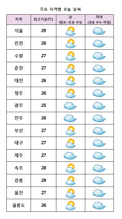 ¿À´Ã ³· ±â¿ÂÀº ¼¿ï¡¤°¸ª 29¡É, ´ë±¸¡¤ºÎ»ê¡¤Á¦ÁÖ 27¡É, ´ëÀü¡¤ÀüÁÖ 26¡É µî Àü±¹ÀÌ 26~29¡ÉÀÇ ºÐÆ÷¸¦ º¸À̰ڴÙ.