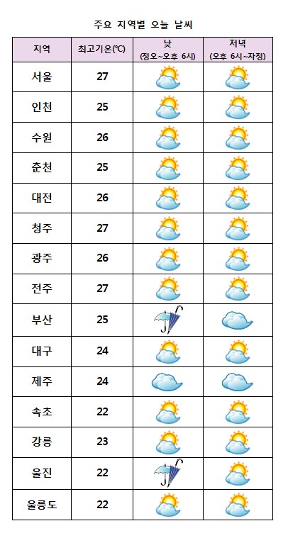 ¹Î°£±â»ó±â¾÷ ÄÉÀÌ¿þ´õ´Â ¡°¿À´Ã ¿ì¸®³ª¶ó´Â µ¿ÇØ»ó¿¡ À§Ä¡ÇÑ °í±â¾ÐÀÇ °¡ÀåÀÚ¸®¿¡ µé°ÚÀ¸³ª, Á¦ÁÖµµ´Â Á¦ÁÖµµ³²ÂÊÇØ»óÀ» Áö³ª´Â ±â¾Ð°ñÀÇ ¿µÇâÀ» ¹Þ°Ú´Ù¡±¸ç ¡°Àü±¹¿¡ ±¸¸§ÀÌ ¸¹°ÚÀ¸³ª Á¦ÁÖµµ´Â È帰 °¡¿îµ¥ ¿ÀÀü±îÁö °¡²û ºñ°¡ ¿À´Â °÷ÀÌ ÀÖ°Ú´Ù¡±°í ¿¹º¸Çß´Ù. ÀÌ¾î ¡°µ¿Ç³ÀÇ ¿µÇâÀ¸·Î °æ»óÇØ¾ÈÀº ¾ÆÄ§ºÎÅÍ ³· »çÀÌ °¡²û ºñ°¡ ¿À´Â °÷ÀÌ ÀÖ°Ú°í, °¿ø¿µµ¿°ú °æ»ó³»·ú¿¡´Â ³· µ¿¾È »ê¹ßÀûÀ¸·Î ºø¹æ¿ïÀÌ ¶³¾îÁö´Â °÷ÀÌ ÀÖ°Ú´Ù¡±°í ÀüÇß´Ù. * ¿¹»ó °¼ö·®(12ÀÏ) - °æ»óÇØ¾È, Á¦ÁÖµµ : 5~20mm ¿À´Ã ³· ±â¿ÂÀº ¼¿ï¡¤Ã»ÁÖ¡¤ÀüÁÖ 27¡É, Ãáõ¡¤ºÎ»ê 25¡É, °¸ª 23¡É µî Àü±¹ÀÌ 22~27¡ÉÀÇ ºÐÆ÷¸¦ º¸À̰ڴÙ.