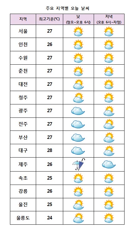 * ¿¹»ó °¼ö·®(19~20ÀÏ) - Á¦ÁÖµµ(19~20ÀÏ) : 30~80mm(¸¹Àº °÷ Á¦Áֻ갣 120mmÀÌ»ó) - ±× ¹ÛÀÇ Àü±¹(20ÀÏ) : 20~60mm ¿À´Ã ³· ±â¿ÂÀº ¼¿ï¡¤´ëÀü 25¡É, ºÎ»ê¡¤Á¦ÁÖ 26¡É, °¸ª 24¡É µî Àü±¹ÀÌ 24~26¡ÉÀÇ ºÐÆ÷¸¦ º¸À̰ڴÙ.