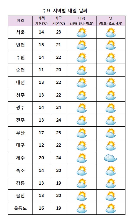 ¾ÆÄ§ ÃÖÀú±â¿ÂÀº 11¡É¿¡¼ 20¡É, ³· ÃÖ°í±â¿ÂÀº 19¡É¿¡¼ 24¡É°¡ ¿¹»óµÈ´Ù.