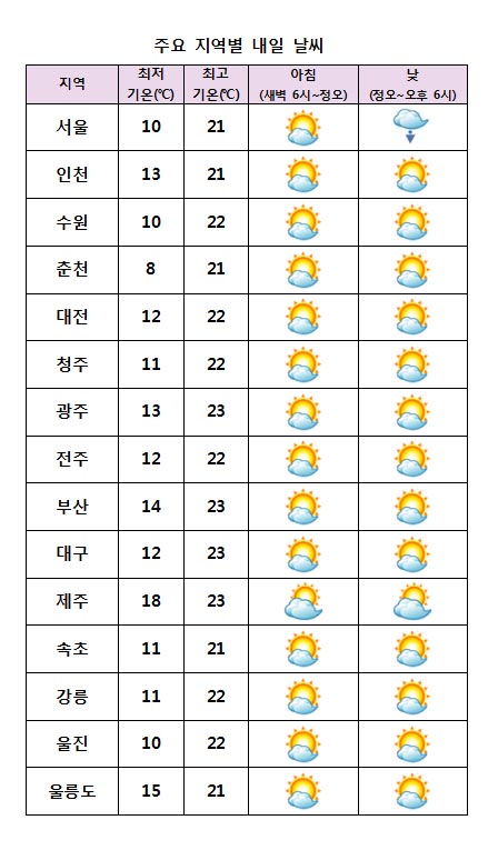 ¾ÆÄ§ ÃÖÀú±â¿ÂÀº 8¡É¿¡¼ 18¡É, ³· ÃÖ°í±â¿ÂÀº 21¡É¿¡¼ 23¡É¸¦ ¿¹»óµÈ´Ù. ¹Ù´ÙÀÇ ¹°°áÀº ¼Çػ󿡼 1~3m, ³²ÇØ¿Í µ¿Çػ󿡼 2~4m·Î ³ô°Ô ÀϰڴÙ. °¿ø¿µµ¿°ú °æºÏµ¿ÇؾÈ, ¼ÇؾȰú Á¦ÁÖµµ´Â °Ç³ÁÖÀǺ¸°¡ ¹ßÈ¿µÈ °¡¿îµ¥ ³»ÀÏ ¿ÀÀü±îÁö ¹Ù¶÷ÀÌ ¸Å¿ì °ÇÏ°Ô ºÒ°Ú´Ù. ±× ¹ÛÀÇ Áö¿ª¿¡¼µµ ¹Ù¶÷ÀÌ °ÇÏ°Ô ºÎ´Â °÷ÀÌ ÀÖ¾î ÁÖÀǰ¡ ¿ä±¸µÈ´Ù.