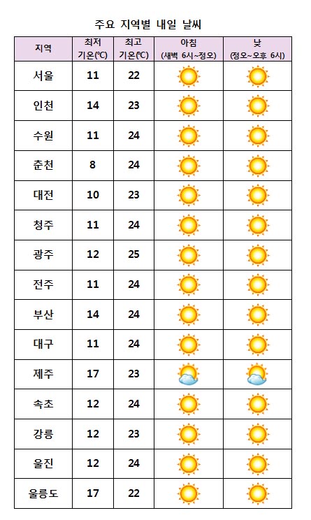 °³ÃµÀýÀÎ ³»ÀÏ(3ÀÏ¡¤¼ö)Àº Àü±¹ÀÌ ´ëü·Î ¸¼Àº °¡¿îµ¥ ¾ÆÄ§Àú³áÀ¸·Î ½Ò½ÒÇϰڴÙ. ¹Î°£±â»ó±â¾÷ ÄÉÀÌ¿þ´õ´Â ¡°³»ÀÏ ¿ì¸®³ª¶ó´Â Áß±¹ ºÏµ¿Áö¹æ¿¡ À§Ä¡ÇÑ °í±â¾ÐÀÇ ¿µÇâÀ» ¹Þ¾Æ Àü±¹ÀÌ ´ëü·Î ¸¼°Ú´Ù¡±¸ç ¡°³»ÀÏ ¾ÆÄ§±îÁö Æò³âº¸´Ù ³·Àº ±â¿Â ºÐÆ÷¸¦ º¸À̰ڰí, ¹Ù¶÷µµ °ÇÏ°Ô ºÒ¾î ½Ò½ÒÇÏ°Ô ´À²¸Áö°Ú´Ù¡±°í ¿¹º¸Çß´Ù. ¾ÆÄ§ ÃÖÀú±â¿ÂÀº 8¡É¿¡¼ 17¡É, ³· ÃÖ°í±â¿ÂÀº 22¡É¿¡¼ 25¡É°¡ ¿¹»óµÈ´Ù. ¹Ì¼¼¸ÕÁö ³óµµ´Â Àü±¹ÀÇ ´ë±â ¼øÈ¯ÀÌ ¿øÈ°ÇØ ¡®ÁÁÀ½¡¯ ´Ü°è°¡ µÇ°Ú´Ù. Àڿܼ± Áö¼ö´Â Àü±¹ÀÌ ÀÏ»çÀÇ ¿µÇâÀ¸·Î ¡®¾à°£ ³ª»Ý¡¯ ´Ü°è°¡ ¿¹»óµÈ´Ù. ¹Ù´ÙÀÇ ¹°°áÀº ÀüÇØ»ó¿¡¼ 0.5~2.5m·Î ÀϰڴÙ. ¸ð·¹(4ÀÏ)ºÎÅÍ Á¦ÁÖµµÀüÇØ»ó°ú ³²Çػ󿡴 ¹Ù¶÷ÀÌ °ÇÏ°Ô ºÒ°í ¹°°áÀÌ ³ô°Ô ÀϰڴÙ. ÇÑÆí Á¦ 25È£ ÅÂdz Äá·¹ÀÌ(KONG-RAY)ÀÇ °£Á¢ÀûÀÎ ¿µÇâÀ¸·Î 4ÀÏ Á¦ÁÖµµ¿¡¼ ºñ°¡ ¿À±â ½ÃÀÛÇØ 5~7ÀÏÀº ³²ºÎÁö¹æ, 6~7ÀÏÀº ÃæÃ»µµ±îÁö È®´ëµÇ°Ú´Ù. ÁߺÎÁö¹æÀº °í±â¾ÐÀÇ °¡ÀåÀÚ¸®¿¡ µé¸é¼ À̹ø ÁÖ ´ëü·Î ±¸¸§¸¸ ¸¹°Ú´Ù. ÃÖÀ¯¸® ¿ÂÄÉÀÌ¿þ´õ ±âÀÚ YRmeteo@onkweather.com