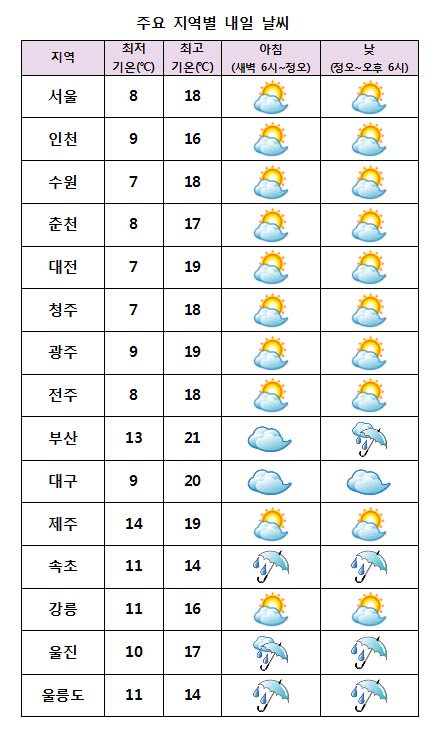 ¾ÆÄ§ ÃÖÀú±â¿ÂÀº 7¡É¿¡¼ 14¡É, ³· ÃÖ°í±â¿ÂÀº 14¡É¿¡¼ 21¡É°¡ µÇ°Ú´Ù. ¿À´Ã ³·ºÎÅÍ È®ÀåµÈ Âù ´ë·ú°í±â¾ÐÀÇ ¿µÇâÀ¸·Î ±â¿ÂÀÌ ´Ù½Ã ³·¾ÆÁ® ½Ò½ÒÇØ Áö°Ú°í, ³»·úÀ» Áß½ÉÀ¸·Î ³·°ú ¹ãÀÇ ±â¿ÂÂ÷°¡ 10¡É ÀÌ»ó Å©°Ú´Ù. ±â¿ÂÀÌ ¶³¾îÁö¸é¼ ´çºÐ°£ »õº®ºÎÅÍ ¾ÆÄ§ »çÀÌ¿¡ Áߺγ»·ú°ú ³²ºÎ»êÁö¿¡´Â ¼¸®°¡ ³»¸®´Â °÷ÀÌ ÀÖ°Ú°í, °¿ø»êÁö¿¡´Â ¾óÀ½ÀÌ ¾î´Â °÷µµ ÀÖ°Ú´Ù. ¹Ù´ÙÀÇ ¹°°áÀº ¼ÇØ¿Í ³²Çػ󿡼 0.5~2m·Î Àϰڰí, µ¿Çػ󿡼 ÃÖ°í 3m·Î ³ô°Ô ÀϰڴÙ. ¿À´Ã ¹ãºÎÅÍ ÇØ¾ÈÀ» Áß½ÉÀ¸·Î ¹Ù¶÷ÀÌ °ÇÏ°Ô ºÎ´Â °÷ÀÌ ÀÖ°í, ³»·ú¿¡µµ ¾à°£ °ÇÏ°Ô ºÎ´Â °÷ÀÌ ÀÖ°Ú´Ù. ³»ÀÏ(17ÀÏ) ¼ÇØ»ó°ú µ¿ÇØ»óÀº ¹Ù¶÷ÀÌ °ÇÏ°Ô ºÒ°í, ¹°°áÀÌ ³ô°Ô ÀÏ°Ú°í ¸ð·¹(18ÀÏ)±îÁö µ¿Çػ󿡴 µ¹Ç³°ú ÇÔ²² õµÕ¡¤¹ø°³°¡ Ä¡´Â °÷ÀÌ ÀÖ°Ú´Ù. ±¹³»ÀÇ ´ë±â ¼øÈ¯ÀÌ ¿øÈ°ÇØÁ® ¹Ì¼¼¸ÕÁö ³óµµ´Â ÁߺÎÁö¹æÀÌ º¸Åë ³»Áö ÁÁÀ½ ´Ü°è°¡ µÇ°Ú´Ù. ÃæºÏ°ú ³²ºÎÁö¹æÀº ¿ÀÀü±îÁö 'ÇѶ§ ³ª»Ý' ´Ü°è¸¦ º¸ÀÌ´Ù ¿ÀÈÄ¿¡ 'º¸Åë' ¼öÁØÀ¸·Î ³·¾ÆÁö°Ú´Ù. Àڿܼ± Áö¼ö´Â Àü±¹ÀÌ ±¸¸§ÀÌ ¸¹Àº ³¯¾¾¸¦ º¸ÀÌ¸ç ±¸¸§¿¡ Àϻ簡 Â÷´ÜµÅ ¡®º¸Å롯 ´Ü°è·Î ¿¹»óµÈ´Ù. ´çºÐ°£ ´ëü·Î ¸¼Àº ³¯¾¾°¡ À̾îÁö¸é¼ ´ë±â°¡ °ÇÁ¶ÇϰÚÀ¸´Ï »êºÒÀ» Æ÷ÇÔÇÑ °¢Á¾ ÈÀç »ç°í¿¡ À¯ÀÇÇØ¾ß°Ú´Ù. ÇÑÆí À̹ø ÁÖ´Â °í±â¾ÐÀÇ ¿µÇâÀ¸·Î °¡²û ±¸¸§ÀÌ ¸¹°ÚÀ¸³ª µ¿Ç³ÀÇ ¿µÇâÀ¸·Î 16ÀÏ °¿ø¿µµ¿¿¡ ºñ°¡ ¿À°Ú°í, 17ÀϺÎÅÍ 18ÀϱîÁö´Â µ¿Çؾȿ¡ ºñ°¡ ³»¸®°Ú´Ù. ÃÖÀ¯¸® ¿ÂÄÉÀÌ¿þ´õ ±âÀÚ YRmeteo@onkweather.com