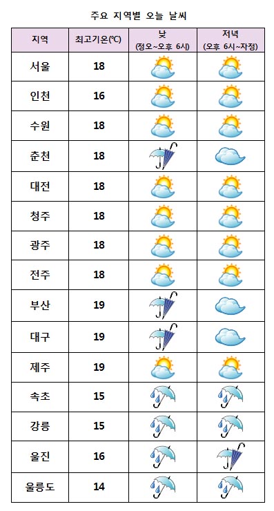 ¿À´Ã ³· ±â¿ÂÀº ¼¿ï¡¤±¤ÁÖ 18¡É, ºÎ»ê¡¤´ë±¸¡¤Á¦ÁÖ 19¡É µî Àü±¹ÀÌ 14~19¡ÉÀÇ ºÐÆ÷¸¦ º¸À̰ڴÙ.