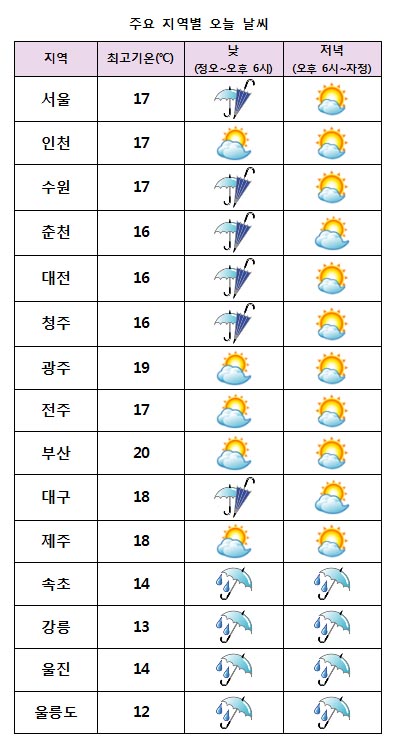 Âù ´ë·ú°í±â¾ÐÀÌ È®ÀåÇÏ¸é¼ ´çºÐ°£ ¾ÆÄ§ ±â¿ÂÀÌ Æò³âº¸´Ù 2~4¡É ³·°Ú°í, ³»·úÀ» Áß½ÉÀ¸·Î ³·°ú ¹ãÀÇ ±â¿ÂÂ÷µµ 10¡É ÀÌ»ó Å©°Ô ¹ú¾îÁö°Ú´Ù. ³· ±â¿ÂÀº ¼¿ï¡¤ÀüÁÖ 17¡É, ´ë±¸¡¤Á¦ÁÖ 18¡É, ºÎ»ê 20¡É µî Àü±¹ÀÌ 12~20¡ÉÀÇ ºÐÆ÷¸¦ º¸À̰ڴÙ.