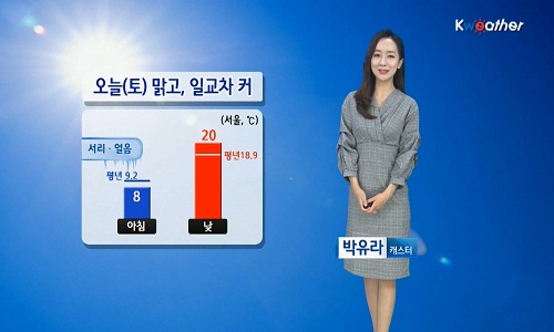 Åä¿äÀÏÀÎ ¿À´Ã(20ÀÏ¡¤Åä)Àº ´ëü·Î ¸¼Àº °¡¿îµ¥ Àϱ³Â÷°¡ Å©°Ô ¹ú¾îÁö°Ú°í, ´ë±â°¡ Â÷Ãû °ÇÁ¶ÇØÁö°Ú´Ù. ¹Î°£±â»ó±â¾÷ ÄÉÀÌ¿þ´õ¿¡ µû¸£¸é ¿À´Ã(20ÀÏ¡¤Åä)Àº Áß±¹ »êµÕ¹Ýµµ ºÎ±Ù¿¡ À§Ä¡ÇÑ °í±â¾ÐÀÇ ¿µÇâÀ¸·Î Àü±¹ÀÌ ´ëü·Î ¸¼°Ú´Ù. ¾ÆÄ§ ÃÖÀú±â¿ÂÀº 4~13¡É±îÁö ¶³¾îÁ® ´Ù¼Ò Ãä°Ú°í, ÀϺΠÁö¿ªÀº ¼¸®°¡ ³»¸®°í ¾óÀ½ÀÌ ¾î´Â °÷ÀÌ ÀÖ°Ú´Ù. ³· ÃÖ°í±â¿ÂÀº 17~21¡É±îÁö ¿Ã¶ó ¼±¼±ÇϰڴÙ. ´Ù¸¸, Àϱ³Â÷°¡ Å« ¸¸Å ¿ÊÂ÷¸²¿¡ À¯ÀÇÇØ¾ß°Ú´Ù. ¹Ì¼¼¸ÕÁö ³óµµ´Â 'ÁÁÀ½' ³»Áö 'º¸Åë' ´Ü°è·Î ´ë±âÁúÀº ±ú²ýÇϰڴÙ. ¹Ù´ÙÀÇ ¹°°áÀº µ¿ÇØ¿Í ³²ÇØ»óÀ¸·Î ÃÖ°í 2.5m±îÁö ¾à°£ ³ô°Ô Àϰڰí, µ¿ÇØ»óÀ¸·Î ³Ê¿ï¼ºÆÄµµ°¡ Ä¡´Â °÷ÀÌ ÀÖ°Ú´Ù. ´ÙÀ½ ÁÖ ¿ù¿äÀÏ(22ÀÏ) Á¦ÁÖµµ¸¦ ½ÃÀÛÀ¸·Î È¿äÀÏ(23ÀÏ)¿¡´Â Àü±¹¿¡ °¡À»ºñ°¡ ³»¸± °ÍÀ¸·Î Àü¸ÁµÈ´Ù.