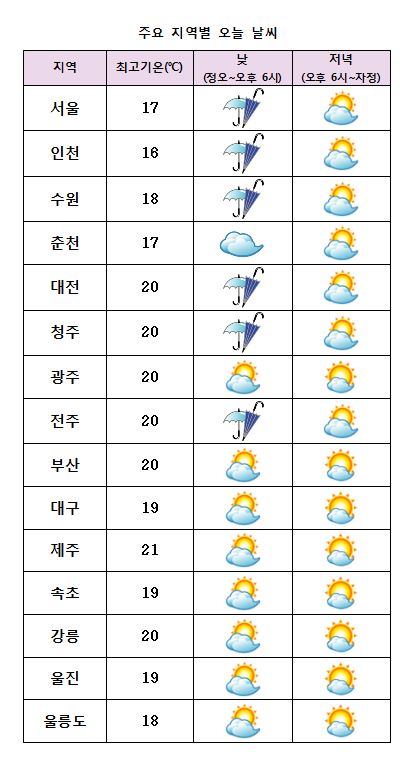 ¿À´Ã Çѳ· ±â¿ÂÀº ¼¿ï 17¡É, ´ëÀü¡¤±¤ÁÖ¡¤ºÎ»ê 20¡É µî Àü±¹ÀÌ 16~20¡É°¡ µÇ°Ú´Ù. ´çºÐ°£ ±â¿ÂÀº Æò³â°ú ºñ½ÁÇϰųª ³ô°Ú°í ³·°ú ¹ãÀÇ ±â¿ÂÂ÷°¡ Å©°Ú´Ù.