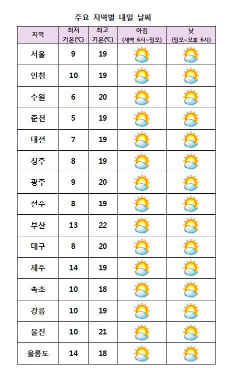 ¾ÆÄ§ ÃÖÀú±â¿ÂÀº 5¡É¿¡¼ 14¡É, ³· ÃÖ°í±â¿ÂÀº 19¡É¿¡¼ 22¡É°¡ µÇ°Ú´Ù. ´çºÐ°£ ±â¿ÂÀº Æò³â°ú ºñ½ÁÇϰųª ³ô°Ú°í, ³·°ú ¹ãÀÇ ±â¿ÂÂ÷°¡ Å©°ÚÀ¸´Ï °Ç°°ü¸®¿¡ ÁÖÀÇÇØ¾ß°Ú´Ù.