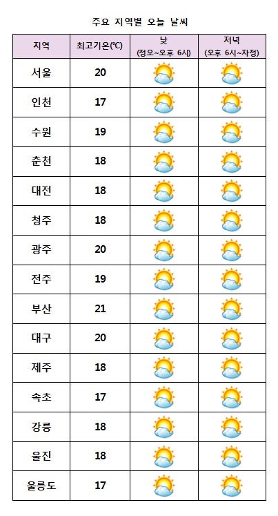 ¿À´Ã ³· ±â¿ÂÀº ¼¿ï¡¤±¤ÁÖ¡¤´ë±¸°¡ 20¡É, Á¦ÁÖ¡¤°¸ª 18¡É µî Àü±¹ÀÌ 17~20¡ÉÀÇ ºÐÆ÷¸¦ º¸À̰ڴÙ.