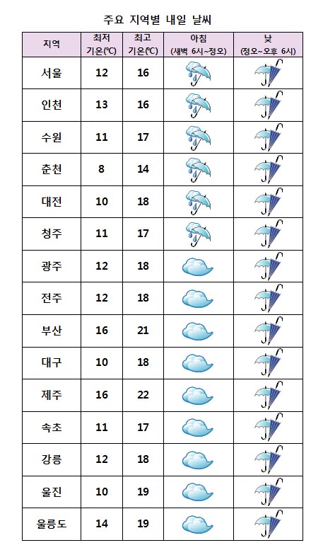 ÇÑÆí À̹ø ÁÖ´Â ±â¾Ð°ñÀÇ ¿µÇâÀ¸·Î 28ÀÏ ÁߺÎÁö¹æ¿¡¼ ºñ°¡ ½ÃÀ۵Š29ÀÏ Àü±¹À¸·Î È®´ëµÇ°Ú´Ù. 30ÀÏÀº ÇØ±âÂ÷¿¡ ÀÇÇØ »ý¼ºµÈ ±¸¸§´ëÀÇ ¿µÇâÀ¸·Î ÃæÃ»µµ¿Í Àü¶óµµ Á¦ÁÖµµ¿¡ ºñ°¡ ¿À°Ú´Ù.