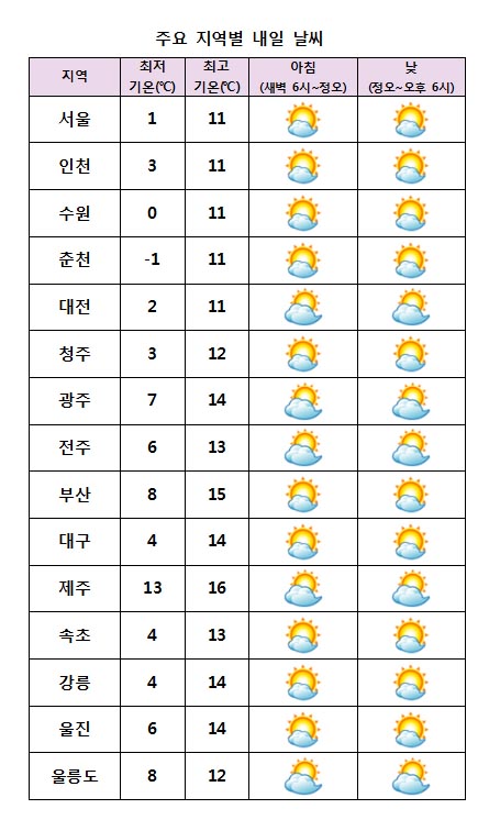 ¾ÆÄ§ ÃÖÀú±â¿ÂÀº -1¡É¿¡¼ 13¡É, ³· ÃÖ°í±â¿ÂÀº 11¡É¿¡¼ 16¡É°¡ µÇ°Ú´Ù.