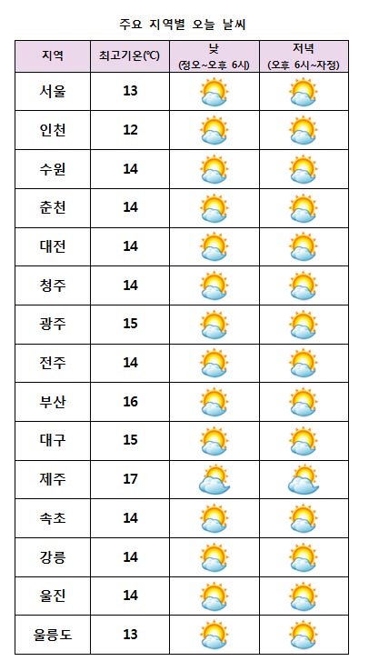 ¿À´Ã ³· ±â¿ÂÀº ¼¿ï 13¡É, ´ëÀü¡¤¼ÓÃÊ 14¡É, ±¤ÁÖ 15¡É, ºÎ»ê 16¡É µî Àü±¹ÀÌ 12~17¡ÉÀÇ ºÐÆ÷¸¦ º¸À̰ڴÙ.