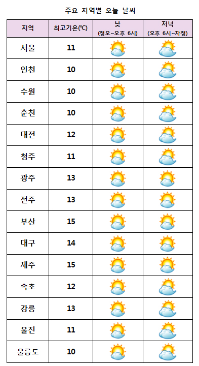 ¿À´Ã ³· ±â¿ÂÀº ¼¿ï 11¡É, °¸ª¡¤±¤ÁÖ 13¡É, ºÎ»ê¡¤Á¦ÁÖ 15¡É µî Àü±¹ÀÌ 10~15¡É°¡ µÇ°Ú´Ù.