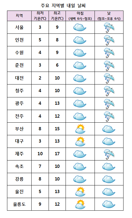 ³»ÀÏÀº ³²¼Ç³ÀÌ ºÒ¸é¼ ±â¿ÂÀÌ Æò³âº¸´Ù ³ô°ÚÀ¸³ª, ¸ð·¹(22ÀÏ)´Â ´ë·ú°í±â¾ÐÀÌ È®ÀåÇÏ¸é¼ Âù °ø±â°¡ À¯ÀԵŠÁߺÎÁö¹æÀÇ ¾ÆÄ§ ±â¿ÂÀÌ ¿µÇÏ·Î ¶³¾îÁö´Â °÷ÀÌ ¸¹°Ú°í, ¹Ù¶÷µµ °ÇÏ°Ô ºÒ¾î ü°¨¿Âµµ´Â ´õ¿í ³·¾Æ Ãä°Ú´Ù. ³²ºÎÁö¹æµµ ¸ð·¹ºÎÅÍ ±â¿ÂÀÌ Â÷Â÷ ³·¾ÆÁö°Ú´Ù.