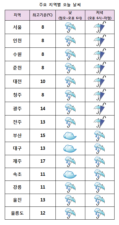 ¿À´Ã ³· ±â¿ÂÀº ¼¿ï¡¤Ãáõ 8¡É, ´ë±¸¡¤ÀüÁÖ 13¡É, ºÎ»ê 15¡É µî Àü±¹ÀÌ 8~17¡ÉÀÇ ºÐÆ÷¸¦ º¸À̰ڴÙ.