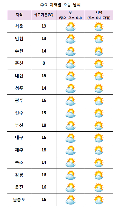¿À´Ã ³· ±â¿ÂÀº ¼¿ï¡¤ÀÎõ 13¡É, ±¤ÁÖ¡¤´ë±¸¡¤°¸ª 16¡É, ºÎ»ê¡¤Á¦ÁÖ 18¡É µî Àü±¹ÀÌ 8~18¡É°¡ µÇ°Ú´Ù.