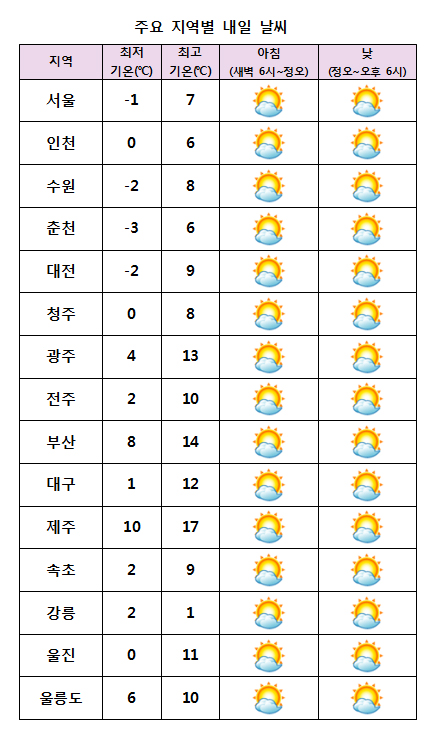 ¾ÆÄ§ ÃÖÀú±â¿ÂÀº -3¡É¿¡¼ 10¡É, ³· ÃÖ°í±â¿ÂÀº 1¡É¿¡¼ 17¡É°¡ µÇ°Ú´Ù. °¿øµ¿ÇؾȰú °¿ø»êÁö¿¡´Â °ÇÁ¶Æ¯º¸°¡ ¹ßÈ¿µÈ °¡¿îµ¥ ´ë±â°¡ ¸Å¿ì °ÇÁ¶Çϰڰí, ±× ¹ÛÀÇ Áö¿ª¿¡µµ ´ë±â°¡ Â÷Â÷ °ÇÁ¶ÇØÁö°Ú´Ù.