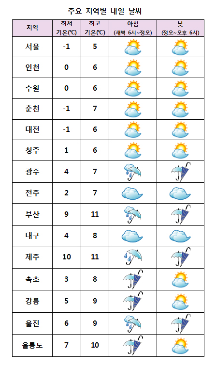 ¸ñ¿äÀÏÀÎ ³»ÀÏ(6ÀÏ)Àº Àü±¹ÀÌ ´ëü·Î È帰 °¡¿îµ¥ °÷°÷ ºñ ¶Ç´Â ´«ÀÌ ³»¸®°Ú´Ù. ¹Î°£±â»ó±â¾÷ ÄÉÀÌ¿þ´õ´Â ¡°³»ÀÏ ¿ì¸®³ª¶ó´Â ³²¼ÂÊ¿¡¼ ´Ù°¡¿À´Â ±â¾Ð°ñÀÇ ¿µÇâÀ» ¹Þ°Ú´Ù¡±¸ç ¡°Àü±¹ÀÌ ´ëü·Î È帰 °¡¿îµ¥ ³²ºÎÁö¹æÀº »õº®¿¡ Á¦ÁÖµµ¿¡¼ ºñ°¡ ½ÃÀ۵оÆÄ§¿¡ Àü³²°ú °æ³², °æºÏ µ¿ÇؾÈÀ¸·Î È®´ëµÈ ÈÄ ³·¿¡ ´ëºÎºÐ ±×Ä¡°Ú´Ù¡±°í ¿¹º¸Çß´Ù. ÀÌ¾î ¡°ºÏÂÊÀ» Áö³ª´Â ¾àÇÑ ±â¾Ð°ñÀÇ ¿µÇâÀ¸·Î ÁߺϺÎÁö¹æ°ú ÃæÃ»ºÏºÎ´Â ¿ÀÈÄ ÇѶ§ ºñ ¶Ç´Â ´«ÀÌ ³»¸®´Â °÷ÀÌ ÀÖ°Ú°í, µ¿Ç³ÀÇ ¿µÇâÀ» ¹Þ´Â °¿ø¿µµ¿Áö¹æÀº »õº®ºÎÅÍ ¾ÆÄ§ »çÀÌ ºñ ¶Ç´Â ´«ÀÌ ¿À°Ú´Ù¡±°í ¿¹º¸Çß´Ù. * ¿¹»ó °¼ö·®(6ÀÏ) - (5ÀϺÎÅÍ)¿ï¸ªµµ, µ¶µµ : 10~30mm - °¿ø¿µµ¿, Àü³², °æºÏµ¿ÇؾÈ, °æ³² : 5~10mm - ÁߺϺÎ(°¿ø¿µµ¿ Á¦¿Ü), ÃæÃ»ºÏºÎ : 5mm ¹Ì¸¸ * ¿¹»ó Àû¼³(6ÀÏ) - °¿ø¿µµ¿ : 1cm¹Ì¸¸ ¾ÆÄ§ ÃÖÀú±â¿ÂÀº -1¡É¿¡¼ 10¡É, ³· ÃÖ°í±â¿ÂÀº 5¡É¿¡¼ 11¡É°¡ µÇ°Ú´Ù.