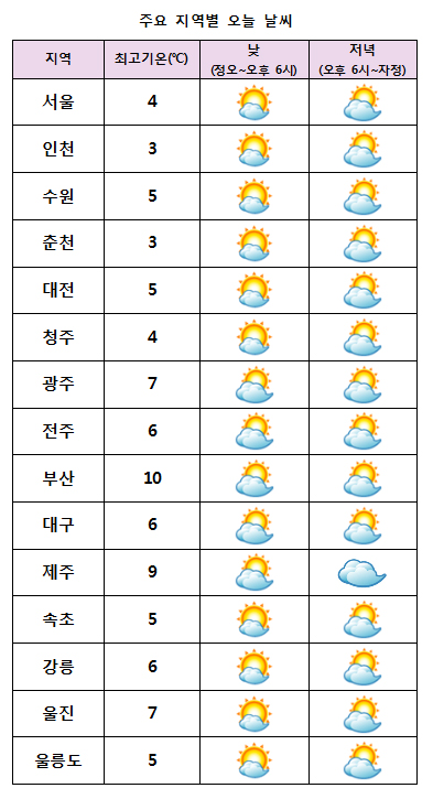 ¿À´Ã ³· ±â¿ÂÀº ¼¿ï¡¤Ã»ÁÖ 4¡É, ´ëÀü¡¤¼ÓÃÊ 5¡É, ºÎ»ê 10¡É µî Àü±¹ÀÌ 3~10¡ÉÀÇ ºÐÆ÷¸¦ º¸À̰ڴÙ.