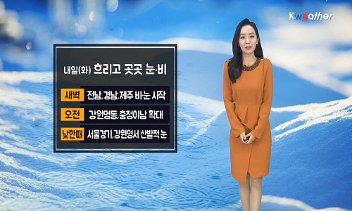 È¿äÀÏÀÎ ³»ÀÏ(11ÀÏ¡¤È)Àº Àü±¹ °÷°÷¿¡ ´« ¶Ç´Â ºñ°¡ ¿À°Ú´Ù. ¹Î°£±â»ó±â¾÷ ÄÉÀÌ¿þ´õ¿¡ µû¸£¸é ³»ÀÏ(11ÀÏ¡¤È)Àº ³²ÇØ»óÀ» Áö³ª´Â ±â¾Ð°ñÀÇ ¿µÇâÀ» ¹Þ°Ú´Ù. Àü±¹ÀÌ ´ëü·Î È帮°Ú°í, »õº®¿¡ Á¦ÁÖµµ¿Í Àü³², °æ³²¿¡ ºñ ¶Ç´Â ´«ÀÌ ½ÃÀ۵Š¿ÀÀü¿¡´Â ±× ¹ÛÀÇ ÃæÃ» À̳²°ú °¿ø¿µµ¿À¸·Î È®´ëµÇ°Ú°í, ¼¿ï/°æ±â, °¿ø¿µ¼ Áö¿ªÀº ³· ÇѶ§ »ê¹ßÀûÀÎ ´«ÀÌ ³¯¸®´Â °÷ÀÌ ÀÖ°Ú´Ù. ¿¹»ó °¼ö·®(11ÀÏ) : Á¦ÁÖµµ, ³²ÇØ¾È 10~40mm, ÃæÃ» À̳²°ú °¿ø¿µµ¿ 5~10mm, ¿¹»ó Àû¼³(11ÀÏ) : Áö¸®»êºÎ±Ù, Á¦Áֻ갣, ¿ï¸ªµµ/µ¶µµ 3~8cm, °¿ø¿µµ¿, Àü¶ó³»·ú, °æ»ó³»·ú(°æºÏºÏºÎÁ¦¿Ü) 1~3cm°¡ µÇ°Ú´Ù. ¾ÆÄ§ ÃÖÀú±â¿ÂÀº -7~5¡É·Î ¾îÁ¦º¸´Ù ±â¿ÂÀÌ Å©°Ô ¿À¸£¸é¼ ÇÑÆÄ°¡ ÁÖÃãÇϰڰí, ³· ÃÖ°í±â¿ÂÀº -7~5¡É·Î ¿¹³â°ú ºñ½ÁÇϰųª Á¶±Ý ³·Àº ±â¿ÂÀ» º¸À̰ڴÙ. ¹Ì¼¼¸ÕÁö ³óµµ´Â Àü±¹ 'º¸Åë' ´Ü°è·Î ´ë±âÁúÀº ÄèÀûÇϰڴÙ. ¹Ù´ÙÀÇ ¹°°áÀº Àü ÇØ»ó¿¡¼ ÃÖ°í 2.0~2.5m·Î ÀϰڴÙ. ´çºÐ°£ ÇÑÆÄ´Â ¾ø°ÚÁö¸¸ ¸ð·¹(12ÀÏ¡¤¼ö)´Â ¿ï¸ªµµ/µ¶µµ¿¡ ´« ¶Ç´Â ºñ°¡ ¿À°Ú°í, ¸ñ¿äÀÏ(13ÀÏ)¿¡´Â ÁߺÎÁö¹æ¿¡ ´« ¶Ç´Â ºñ°¡ ³»¸± °ÍÀ¸·Î Àü¸ÁµÈ´Ù.