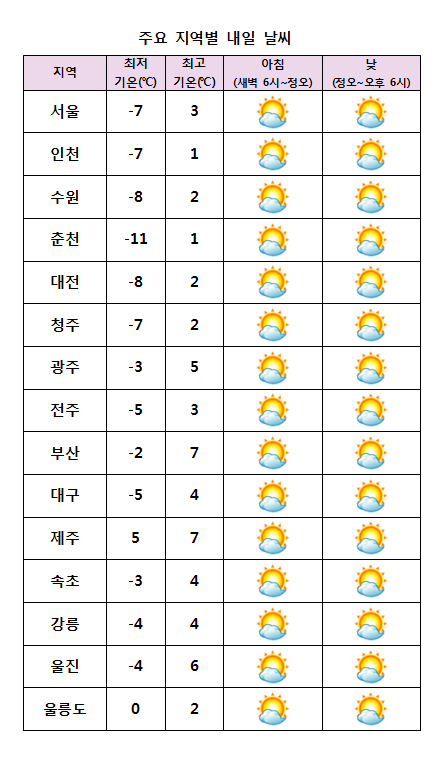±Ý¿äÀÏÀÎ ³»ÀÏ(14ÀÏ)Àº Àü±¹ÀÌ ´ëü·Î ¸¼Àº °¡¿îµ¥ Æò³âº¸´Ù ±â¿ÂÀÌ ³·¾Æ ´Ù¼Ò Ãä°Ú´Ù. ¹Î°£±â»ó±â¾÷ ÄÉÀÌ¿þ´õ´Â ¡°³»ÀÏ ¿ì¸®³ª¶ó´Â Áß±¹ »êµÕ¹Ýµµ ºÎ±Ù¿¡¼ ³²µ¿ÁøÇÏ´Â °í±â¾ÐÀÇ ¿µÇâÀ» ¹Þ°Ú°í, ¿ï¸ªµµ¡¤µ¶µµ´Â ±â¾Ð°ñÀÇ ¿µÇâÀ» ¹Þ´Ù°¡ Á¡Â÷ ¹þ¾î³ª°Ú´Ù¡±¸ç ¡°Àü±¹ÀÌ ´ëü·Î ¸¼Àº °¡¿îµ¥ ¿ï¸ªµµ¿Í µ¶µµ´Â Àú³á±îÁö ´«ÀÌ ¿À´Ù°¡ ±×Ä¡°Ú´Ù¡±°í ¿¹º¸Çß´Ù. ¾ÆÄ§ ÃÖÀú±â¿ÂÀº -11¡É¿¡¼ 5¡É, ³· ÃÖ°í±â¿ÂÀº 1¡É¿¡¼ 7¡É°¡ µÇ°Ú´Ù. ´çºÐ°£ ±â¿ÂÀº Æò³â°ú ºñ½ÁÇϰųª Æò³âº¸´Ù 2~5¡É Á¤µµ ³·Àº ±â¿ÂºÐÆ÷¸¦ º¸ÀÌ¸ç ´Ù¼Ò Ãä°Ú´Ù.  ¹Ù´ÙÀÇ ¹°°áÀº ¼ÇØ¿Í µ¿ÇØ¿¡¼ 3~4m·Î ³ô°Ô Àϰڰí, ¼ÇØ»ó°ú µ¿Çؾչٴٿ¡´Â dz¶ûƯº¸°¡ ¹ßÇ¥µÉ °¡´É¼ºÀÌ ÀÖ°Ú´Ù. ³»ÀÏ(14ÀÏ)±îÁö ÇØ¾È¿¡´Â ¹Ù¶÷ÀÌ °ÇÏ°Ô ºÒ°í, ±× ¹ÛÀÇ ³»·ú¿¡µµ ¾à°£ °ÇÏ°Ô ºÎ´Â °÷ÀÌ ÀÖ°Ú´Ù. Â÷Â÷ °ÇÁ¶ÇÑ °ø±â°¡ À¯ÀÔµÇ¸é¼ Â÷Â÷ °ÇÁ¶ÇØÁö°ÚÀ¸´Ï »êºÒ µî °¢Á¾ ÈÀç ¿¹¹æ¿¡ °¢º°È÷ À¯ÀÇÇØ¾ß°Ú´Ù. ±¹³»¡¤¿Ü¿¡¼ ¹ß»ýÇÑ ´ë±â¿À¿°¹°ÁúÀÌ ¿ÀÈĺÎÅÍ ¼ÂÊÁö¹æÀ» Áß½ÉÀ¸·Î Á¡Â÷ Á¤Ã¼Çϰí ÃàÀûµÇ°Ú´Ù. ÀÌ¿¡ µû¶ó ¼ÂÊÁö¹æÀÇ ¹Ì¼¼¸ÕÁö ³óµµ´Â ¿ÀÈÄ¿¡ ¡®ÇѶ§ ³ª»Ý¡¯, µ¿ÂÊÁö¹æÀº ¡®º¸Å롯 ´Ü°è°¡ µÇ°Ú´Ù. ÇÑÆí À̹ø ÁÖ´Â ±â¾Ð°ñÀÇ ¿µÇâÀ¸·Î 16ÀÏ Àü±¹¿¡ ´« ¶Ç´Â ºñ°¡ ¿À°Ú°í, 18ÀÏÀº ÁߺÎÁö¹æÀ» Áß½ÉÀ¸·Î ´«ÀÌ ¿À°Ú´Ù.