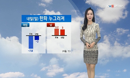 ÀÏ¿äÀÏÀÎ ³»ÀÏ(16ÀÏ¡¤ÀÏ)Àº ÇÑÆÄ°¡ ´©±×·¯Áö°ÚÁö¸¸ Àü±¹ ºñ³ª ´«ÀÌ ¿À°Ú´Ù. ¶Ç ¿ÀÀü±îÁö Ãʹ̼¼¸ÕÁö ³óµµ°¡ ³ôÀ» °ÍÀ¸·Î º¸¿© È£Èí±â °ü¸®¿¡ ÁÖÀǰ¡ ¿ä±¸µÈ´Ù. ¹Î°£±â»ó±â¾÷ ÄÉÀÌ¿þ´õ¿¡ µû¸£¸é ³»ÀÏ(16ÀÏ¡¤ÀÏ)Àº ±â¾Ð°ñÀÇ ¿µÇâÀ» ¹Þ¾Æ Àü±¹ÀÌ ´ëü·Î È帰 °¡¿îµ¥ ºñ³ª ´«ÀÌ ¿À°Ú´Ù. ¿¹»ó Àû¼³(16ÀÏ) : °æ±â¼ÇØ¾È 3~5cm, ¼¿ï/°æ±â, °¿ø¿µ¼, ÃæºÏºÏºÎ 1~3cm, °¿ø¿µµ¿, ÃæºÏ³²ºÎ, Ãæ³², °æºÏ, ÀüºÏ 1cm³»¿Ü°¡ µÇ°Ú´Ù. ¾ÆÄ§ ÃÖÀú±â¿ÂÀº -6~4¡É·Î Æò³â±â¿ÂÀ» 1~3¡É°¡·® ¿ôµ¹°Ú´Ù. ´Ù¸¸, ³·¿¡´Â Àü±¹¿¡ ºñ³ª ´«ÀÌ ¿À¸é¼ 1~9¡ÉÀÇ ±â¿ÂºÐÆ÷·Î ¿¹³âº¸´Ù 1~3¡ÉÁ¤µµ ³·°Ú´Ù. ÇÑÆí, ´ë±âÁúÀº ¿ÀÀü±îÁö ÁÁÁö ¸øÇϰڴÙ. ±¹³»/¿Ü ¿À¿°¹°ÁúÀÇ ¿µÇâÀ¸·Î Ãʹ̼¼¸ÕÁö ³óµµ°¡ Àü±¹ '³ª»Ý' ¼öÁرîÁö Ä¡¼Ú°Ú´Ù. ÇÏÁö¸¸ ¿ÀÈĺÎÅÍ´Â Àü±¹¿¡ ³»¸®´Â ºñ¿Í ´«ÀÌ ´ë±â¿À¿°¹°ÁúµéÀ» ±ú²ýÀÌ ¾Ä°Ü ³»·ÁÁÖ¸é¼ Àü±¹ 'º¸Åë' ´Ü°è¸¦ µÇã°Ú´Ù. ¼ÇØ¿Í µ¿ÇØ»óÀ¸·Î ´«ÀÌ ¿À°Ú°í, ³²ÇØ»óÀº ºñ°¡ ¿À°Ú´Ù. ¹°°áÀº µ¿ÇØ¿Í ³²ÇØ»óÀ¸·Î ÃÖ°í 2.5m±îÁö ¾à°£ ³ô°Ô ÀϰڴÙ. ´çºÐ°£ ¿¹³â ¼öÁØÀ» ¿ôµ¹¸ç °ÇÑ ÇÑÆÄ´Â ¾ø°Ú´Ù. ´Ù¸¸, ¸ñ¿äÀÏ(20ÀÏ)°ú ±Ý¿äÀÏ(21ÀÏ) »çÀÌ Àü±¹¿¡ ´« ¶Ç´Â ºñ°¡ ³»¸± Àü¸ÁÀÌ´Ù.