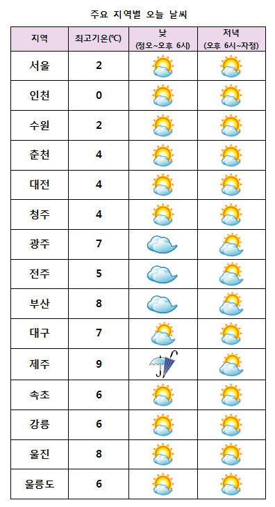 ¿À´Ã ³· ±â¿ÂÀº ¼¿ï 2¡É, ´ëÀü 4¡É, ºÎ»ê 8¡É µî Àü±¹ÀÌ -3¡É¿¡¼ 9¡É°¡ µÇ°Ú´Ù.
