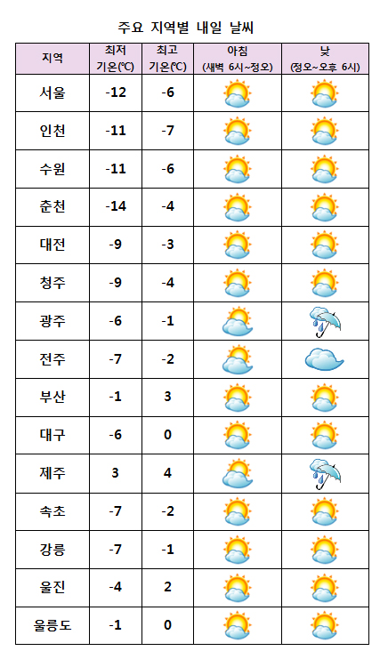 ¿À´Ã ¿ÀÈĺÎÅÍ ºÏ¼ÂÊ¿¡¼ Âù °ø±â°¡ À¯ÀÔµÇ¸é¼ ±â¿ÂÀÌ Å« ÆøÀ¸·Î ¶³¾îÁ® ³»ÀÏ ¾ÆÄ§ ±â¿ÂÀº ¿À´Ã ¾ÆÄ§º¸´Ù 6~9¡É ¶³¾îÁö¸é¼ Æò³âº¸´Ù 2~5¡É ³·°Ú´Ù. ¶ÇÇÑ ¹Ù¶÷µµ °ÇÏ°Ô ºÒ¾î ü°¨¿Âµµ´Â ¼¿ï ±âÁØ -20¡É·Î ³·¾Æ Ãä°Ú´Ù. ³·¿¡µµ ´ëºÎºÐ Áö¿ª¿¡¼ ±â¿ÂÀÌ¿µÇϱǿ¡ ¸Ó¹°°ÚÀ¸´Ï ÃßÀ§·Î ÀÎÇÑ ÇÇÇØ°¡ ¹ß»ýÇÏÁö ¾Êµµ·Ï À¯ÀÇÇØ¾ß°Ú´Ù.