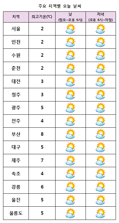 ¿ù¿äÀÏÀÎ ¿À´Ã(7ÀÏ)Àº Àü±¹ÀÌ ´ëü·Î ¸¼Àº °¡¿îµ¥ ¹Ì¼¼¸ÕÁö°¡ ±â½ÂÀ» ºÎ¸®°Ú´Ù. ¹Î°£±â»ó±â¾÷ ÄÉÀÌ¿þ´õ´Â ¡°¿À´Ã ¿ì¸®³ª¶ó´Â Áß±¹ »êµÕ¹Ýµµ ºÎ±Ù¿¡ À§Ä¡ÇÑ °í±â¾ÐÀÇ ¿µÇâÀ» ¹Þ´Ù°¡ ±× °¡ÀåÀÚ¸®¿¡ µé°Ú´Ù¡±¸ç ¡°Àü±¹ÀÌ ´ëü·Î ¸¼´Ù°¡ ¾ÆÄ§ºÎÅÍ ±¸¸§ÀÌ ¸¹¾ÆÁö°Ú´Ù¡±°í ¿¹º¸Çß´Ù. ³· ±â¿ÂÀº ¼¿ï¡¤Ãáõ 2¡É, ´ëÀü¡¤Ã»ÁÖ 3¡É, ±¤ÁÖ¡¤´ë±¸ 5¡É, ºÎ»ê 8¡É µî Àü±¹ÀÌ 2~8¡ÉÀÇ ºÐÆ÷¸¦ º¸À̰ڴÙ. ÇÑÆÄÆ¯º¸°¡ ¹ßÈ¿ ÁßÀÎ °æ±âºÏºÎ¿Í °¿ø¿µ¼, ÃæºÏºÏºÎ, °æºÏºÏºÎ¿¡ ÃßÀ§°¡ Áö¼ÓµÇ´Â °¡¿îµ¥ ³»ÀÏ(8ÀÏ) ÀϽÃÀûÀ¸·Î ÇÑÆÄ ±âÁØÄ¡¿¡¼ ¹þ¾î³ª´Â °÷µµ ÀÖ°ÚÀ¸³ª ¸ð·¹ ´Ù½Ã -10¡É ÀÌÇÏ·Î ¶³¾îÁö¸é¼ Ãß¿öÁö°Ú´Ù. ±× ¹ÛÀÇ Áö¿ª¿¡¼µµ ³»ÀÏ(8ÀÏ) ¿ÀÈĺÎÅÍ Âù °ø±â°¡ À¯ÀÔµÇ¸é¼ Àü±¹ ´ëºÎºÐ Áö¿ªÀÇ ¸ð·¹(9ÀÏ) ¾ÆÄ§ ±â¿ÂÀº ¿µÇϱǿ¡ µé°Ú´Ù. ƯÈ÷ Áߺγ»·úÀº -10¡É ³»¿Ü·Î ¶³¾îÁö´Â °÷ÀÌ ¸¹°Ú°í, ¹Ù¶÷µµ °ÇÏ°Ô ºÒ¾î ü°¨¿Âµµ´Â ´õ¿í ³·¾Æ ¸Å¿ì Ãä°Ú´Ù.